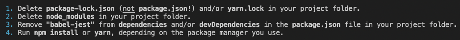 3. Remove "babel-jest" from dependencies and/or devDependencies in the package.json file in your project folder.